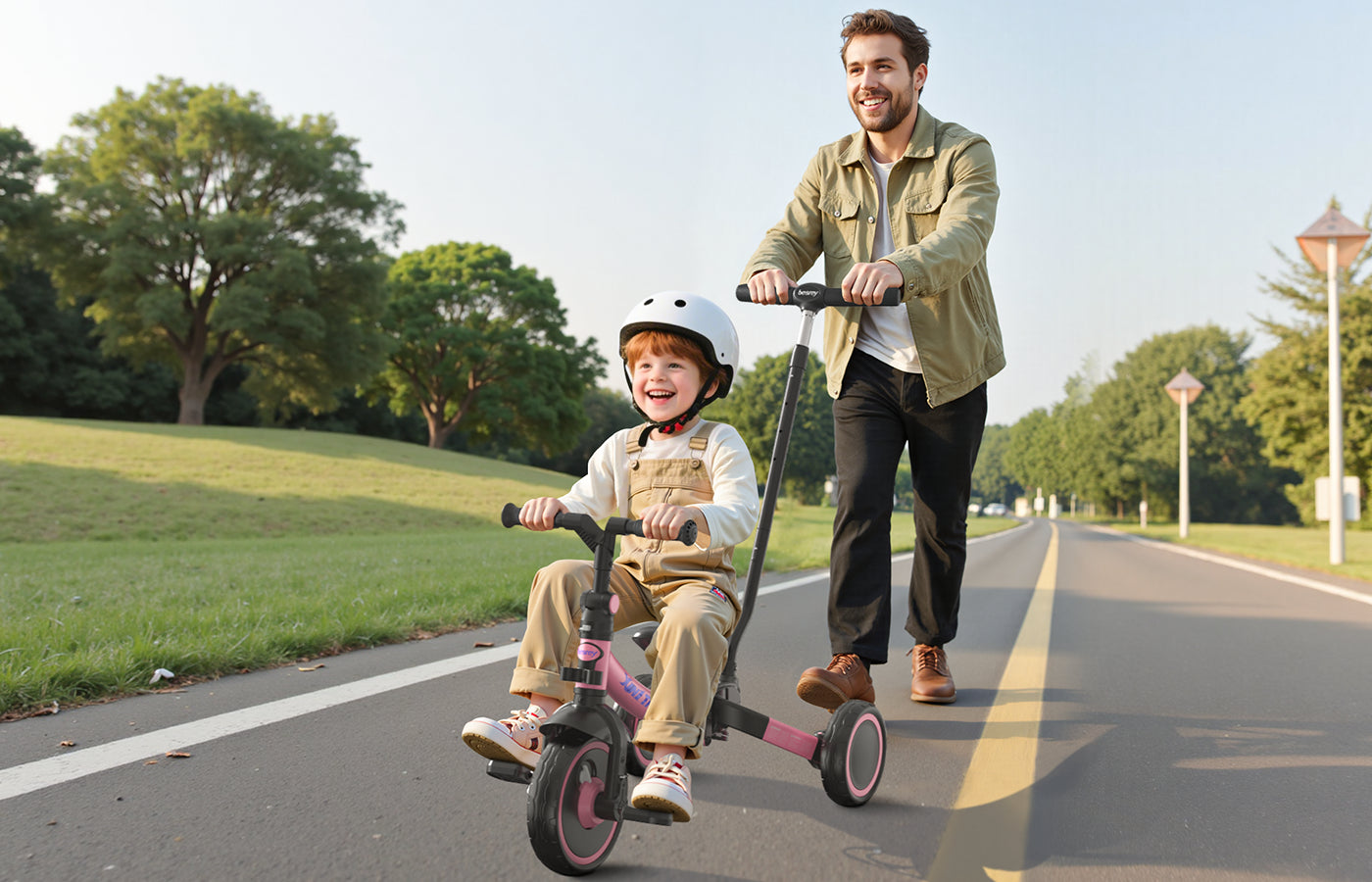 From parent-guided pushing to independent riding, each moment is full of joy and exploration. With an adjustable push handle, shock-absorbing wheels, and a one-button clutch switch enhances ease of use while prioritizing both parental control and child safety.